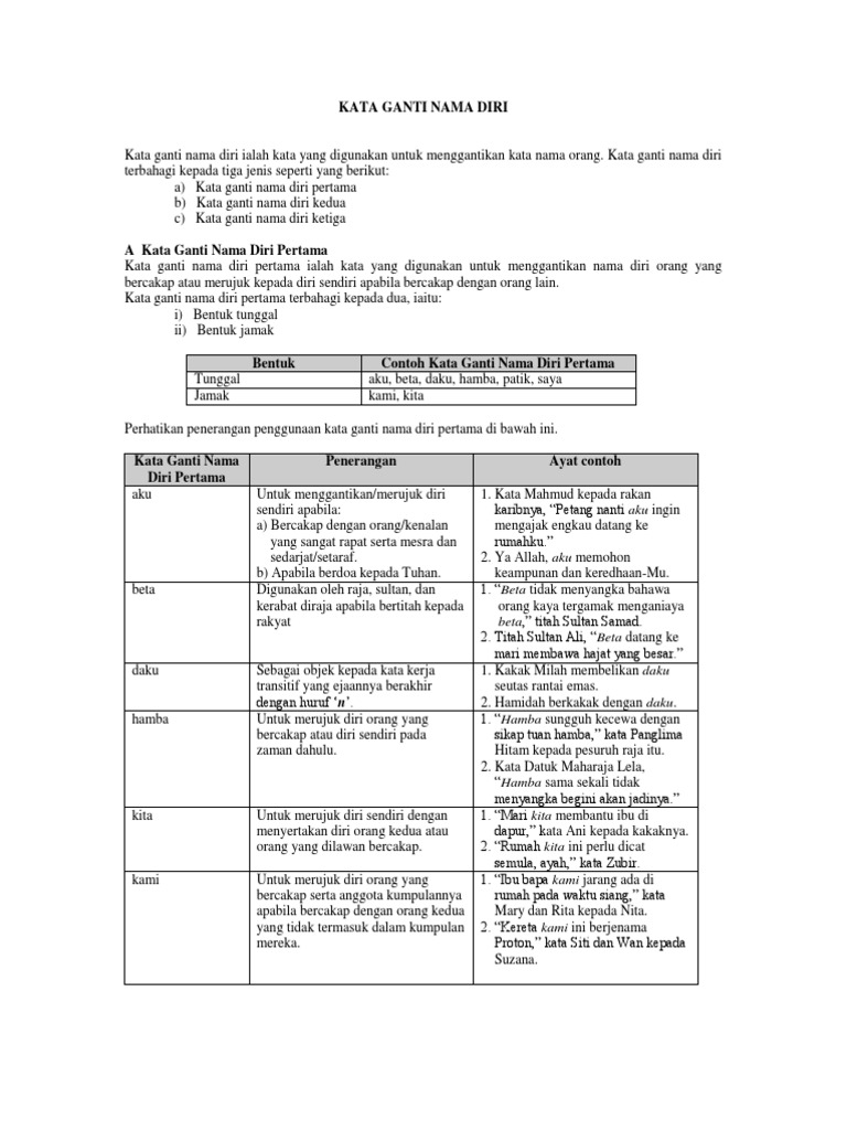 Kata Ganti Nama Diri Kata Ganti Nama Diri Pertama menggantikan nama diri orang yang bertutur. Kata atau ayat merupakan satuan bahasa yang mempunyai arti atau satu pengertian. Kata ganti nama diri kedua merujuk kepada orang yang bercakap dengan kita.